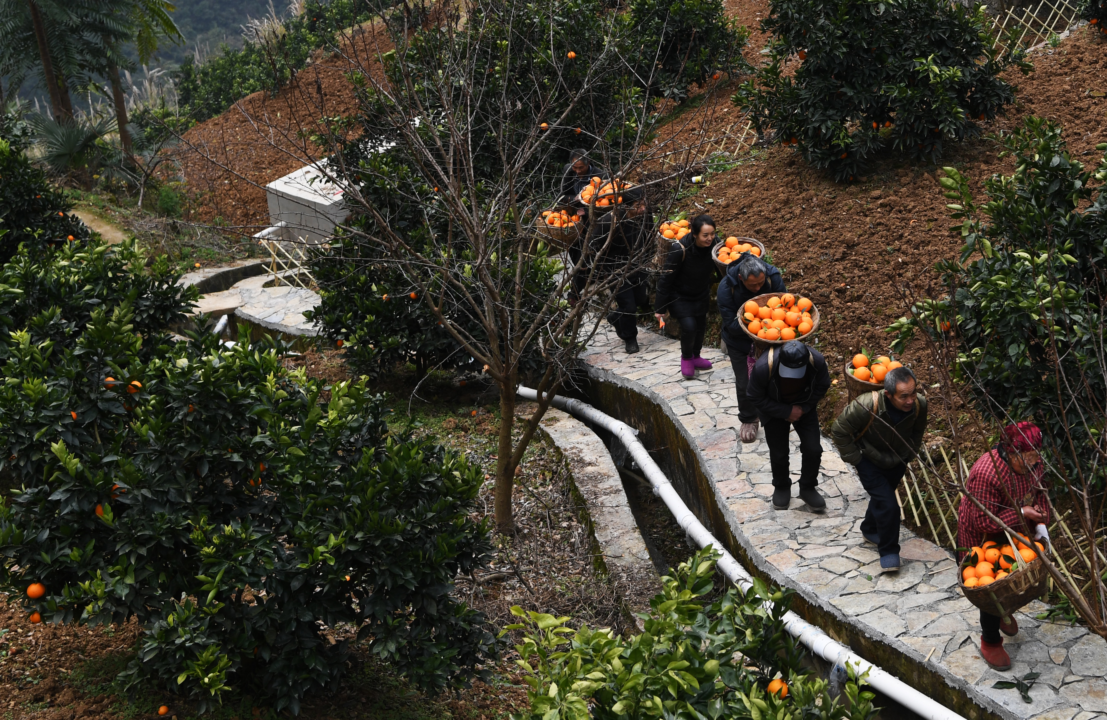 1月7日,毛相林(右二)和下庄村村民在背运刚采摘的柑橘。新华社记者王全超 摄