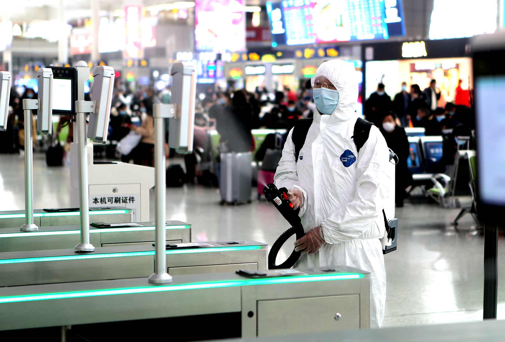 保洁员在上海虹桥火车站对进站闸机进行消毒作业(新华社记者陈飞 摄)