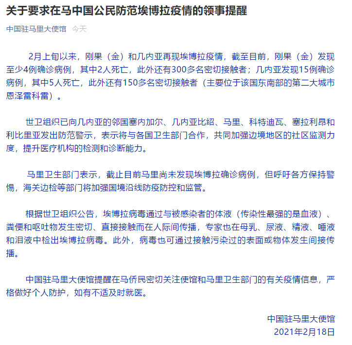 当地时间18日,中国驻马里使馆官方账号发布了关于要求在马中国公民防范埃博拉疫情的领事提醒,内容如下: