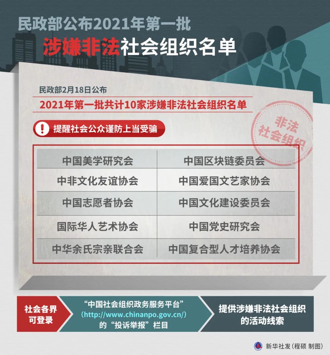 民政部公布2021年第一批共计10家涉嫌非法社会组织名单,提醒社会公众谨防上当受骗。