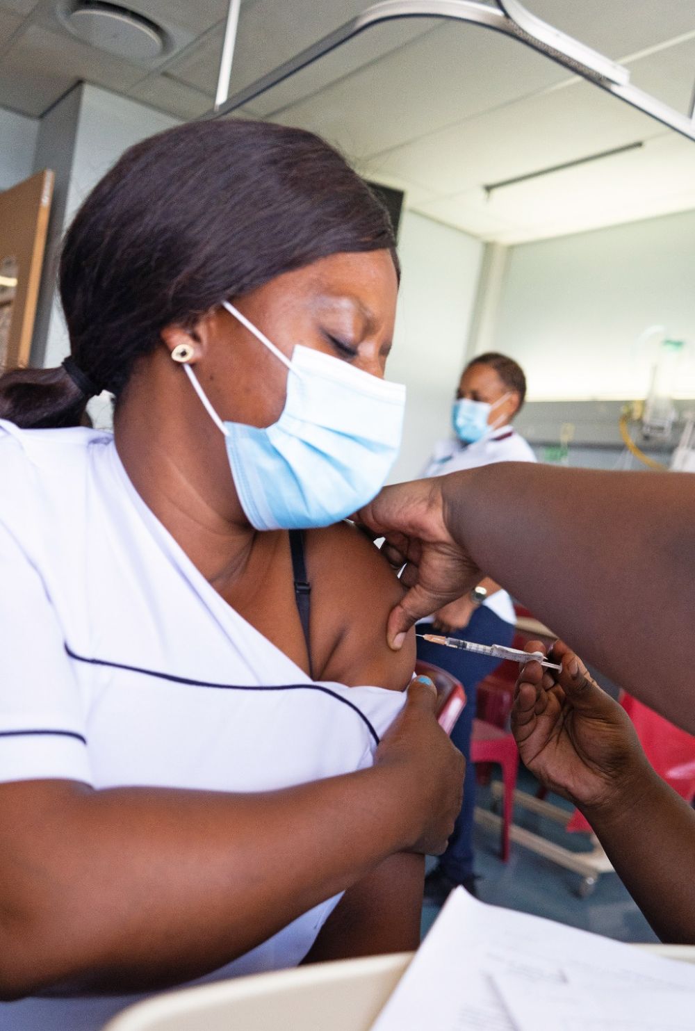 2月18日,在南非比勒陀利亚一家医院,一名医护人员接种新冠疫苗。(新华社发,马修·马丁·布林克摄)