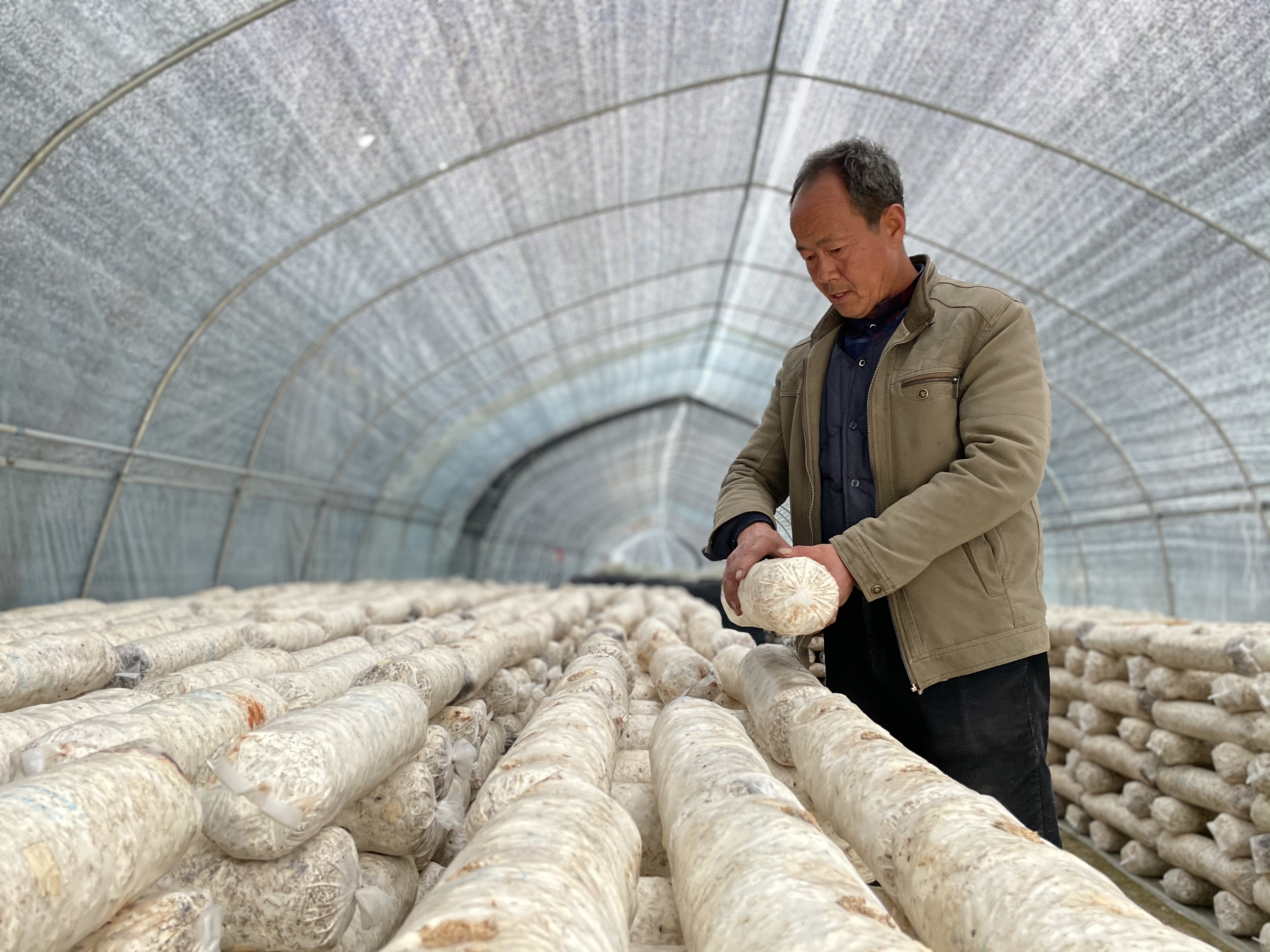 留坝县花草门村村民李正银查看菌筒培养情况。新华社记者张斌 摄
