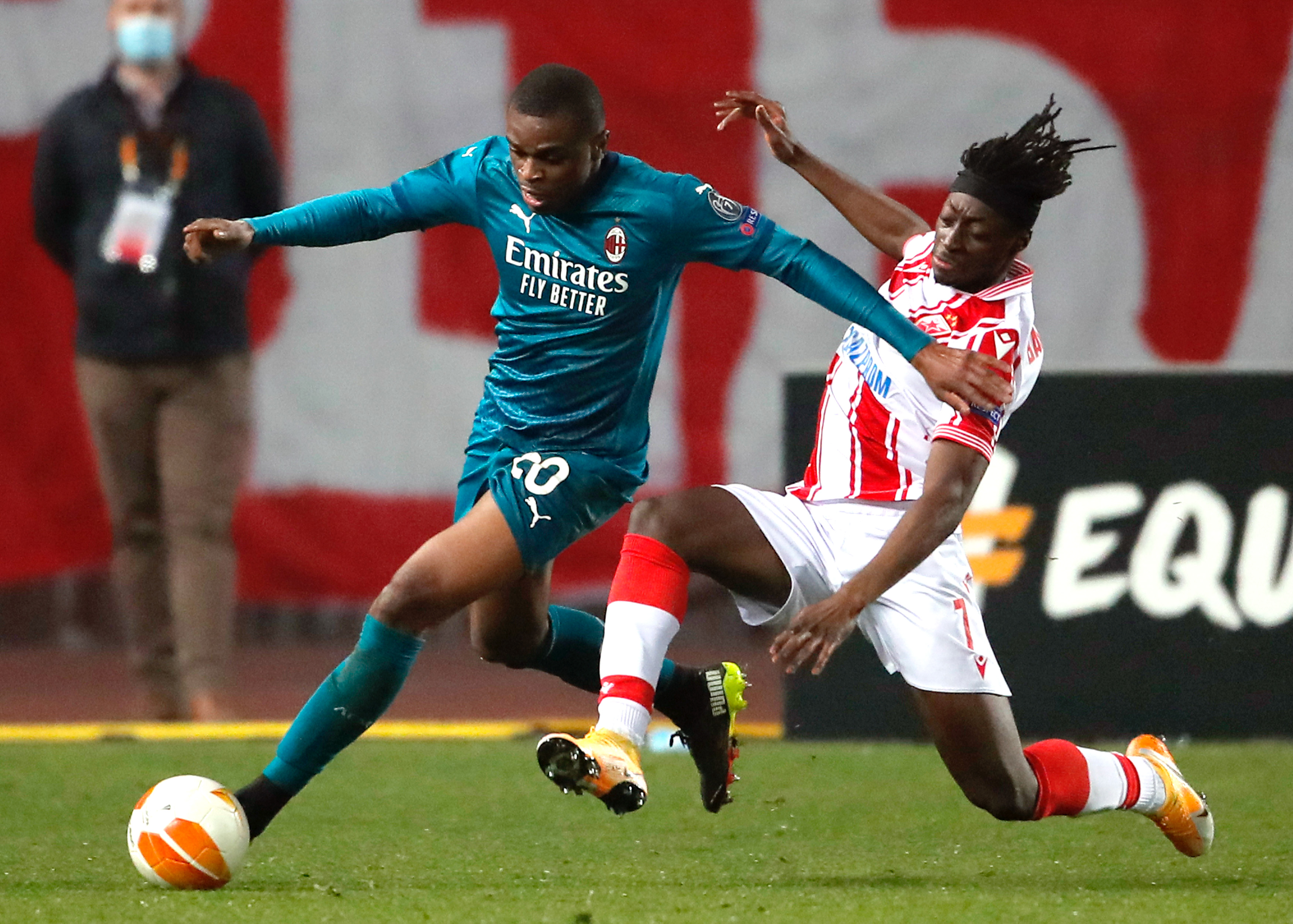 2月18日,贝尔格莱德红星队球员巴卡约科(右)与AC米兰队球员卡卢卢拼抢。新华社发(普雷德拉格·米洛萨夫列维奇摄)
