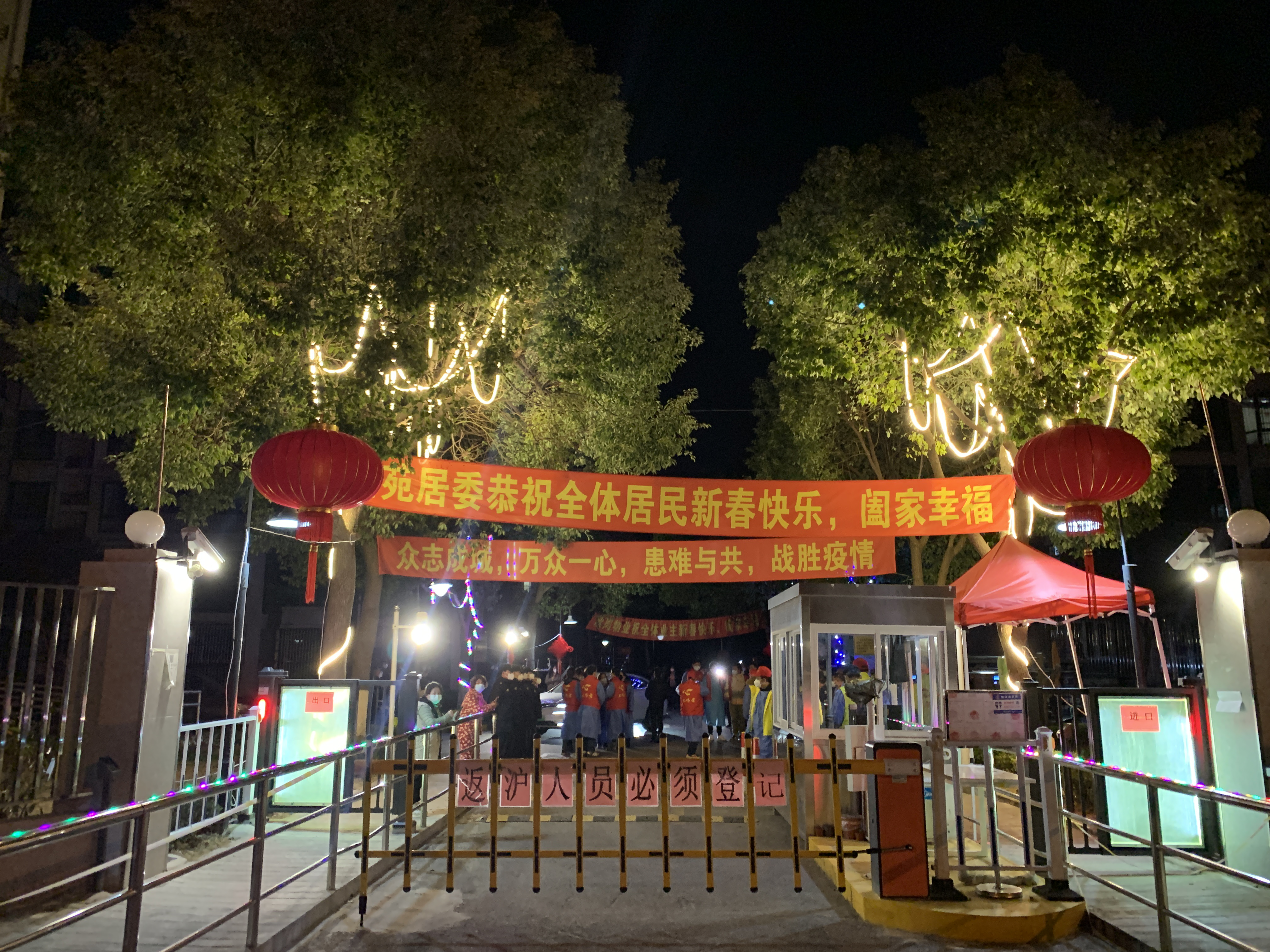 18日晚,记者来到浦东新区高东镇新高苑一期小区门口。虽然已近凌晨,但悬挂的抗疫标语横幅、精心布置的灯带和门内期盼与亲人团聚的居民为牛年新春增添了几分喜庆的气氛。