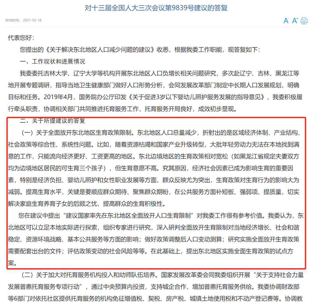 国家卫健委官网2月18日发布《对十三届全国人大三次会议第9839号建议的答复》。该项建议提出全面放开东北地区生育政策限制。