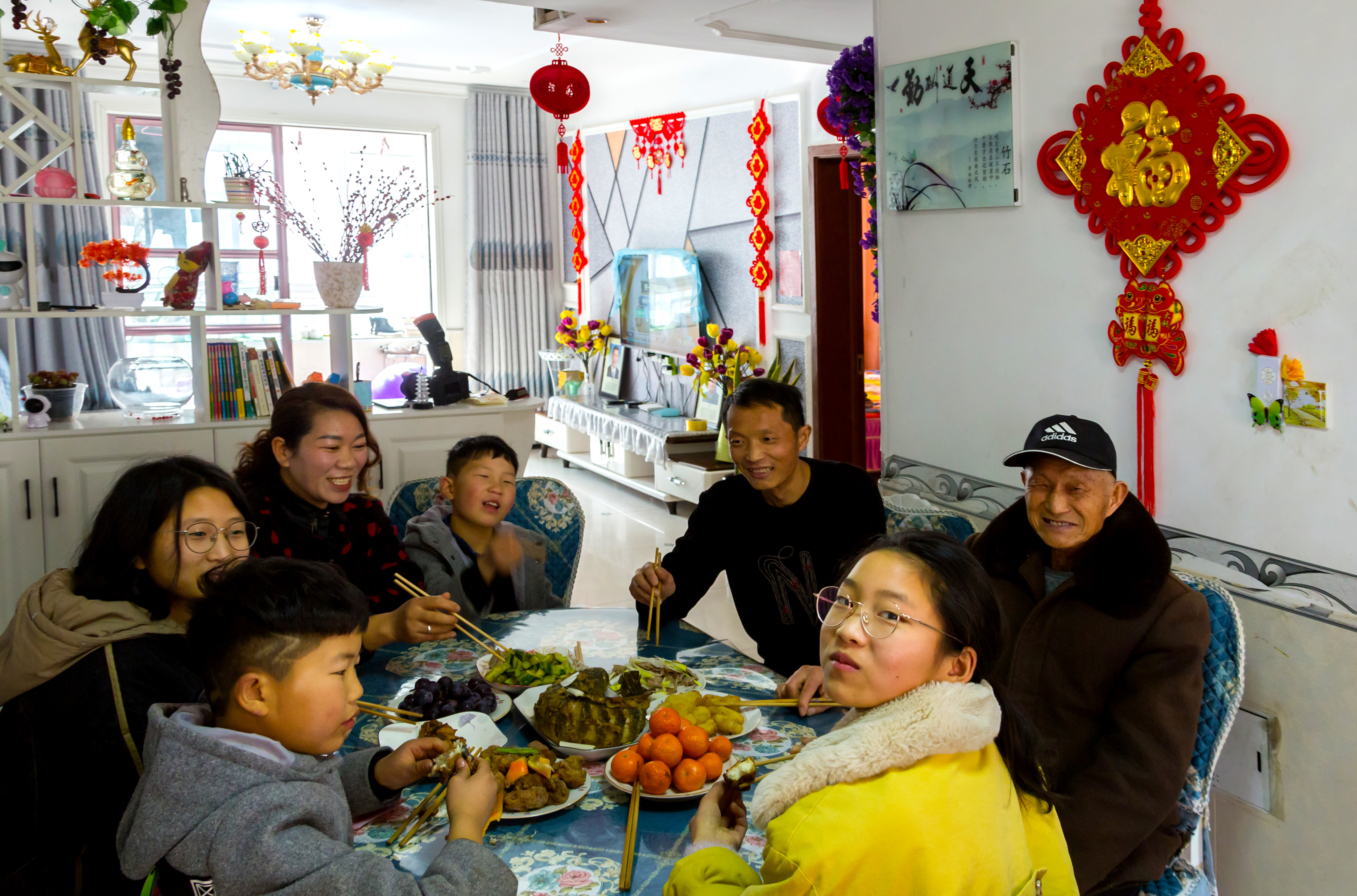 2月11日,在河南省新乡市封丘县李庄镇前辛庄社区,杜英慧一家在吃午饭。新华社通联 孙庆军摄