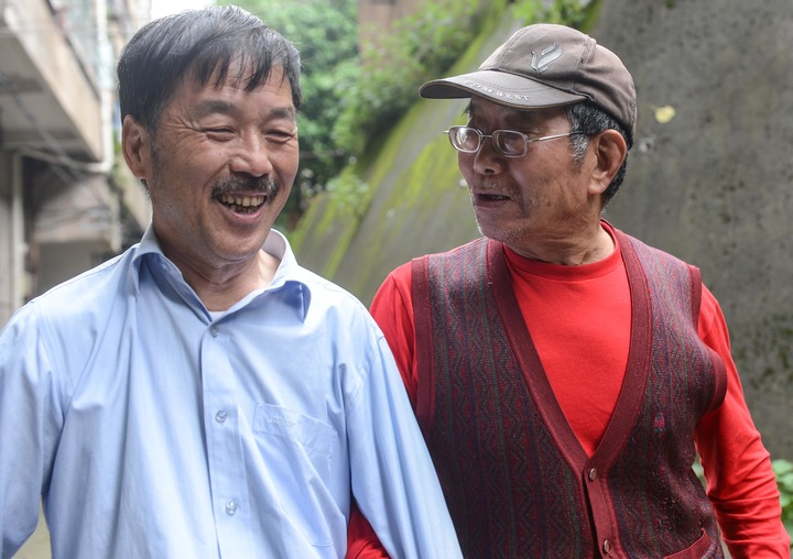 早在2014年,浙江金华就出现了老人互助养老模式。66岁老人童景富(左)陪着74岁老人诸葛智辰在小区散步(摄于2014年)新华社记者 徐昱 摄