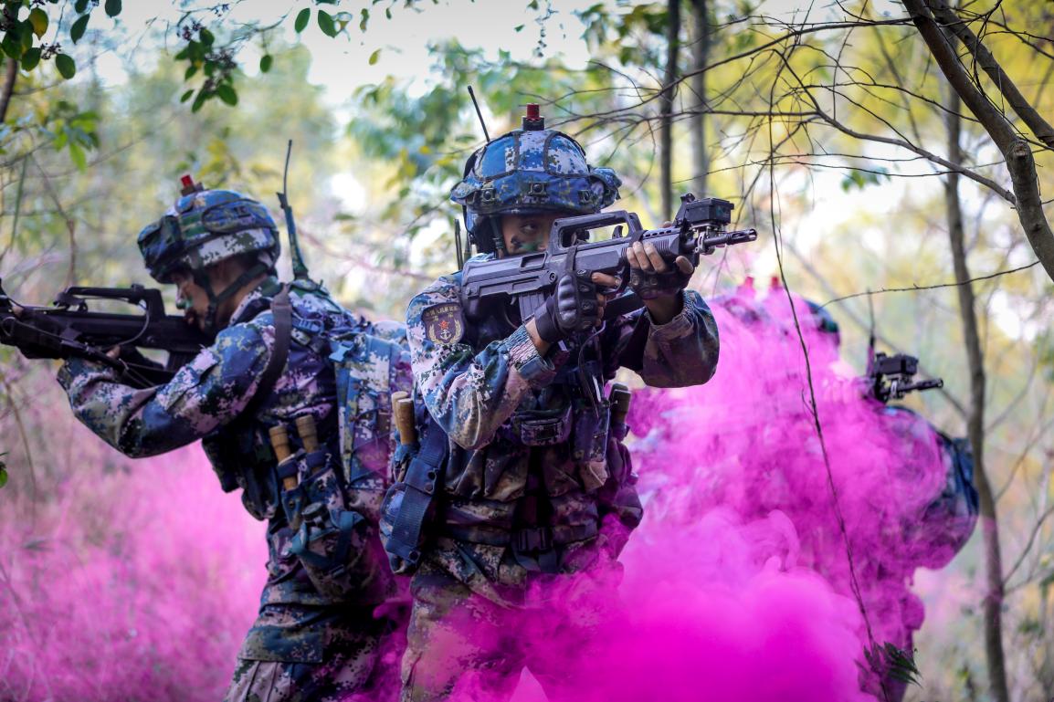 ↑“敌人”试图对我进行侦察,被发现后释放烟雾弹逃逸,陆战队员冲出雾区追击。贾成露 摄