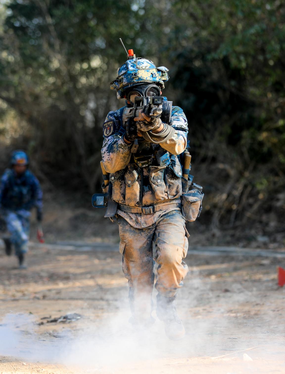 ↑陆战队员穿戴防毒面具快速通过染“毒”地带。贾成露 摄