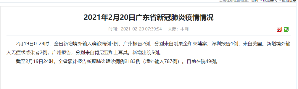 截至2月19日24时,全省累计报告新冠肺炎确诊病例2183例(境外输入787例)。目前在院49例。