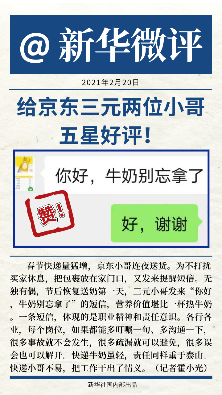 春节快递量猛增,京东小哥连夜送货。为不打扰买家休息,把包裹放在家门口,又发来提醒短信。无独有偶,节后恢复送奶第一天,三元小哥发来“你好,牛奶别忘拿了”的短信,营养价值堪比一杯热牛奶。一条短信,体现的是职业精神和责任意识。各行各业,每个岗位,如果都能多叮嘱一句、多沟通一下,很多事故就不会发生,很多疏漏就可以避免,很多误会也可以解开。快递牛奶虽轻,责任同样重于泰山。快递小哥不易,把工作干出了情义。(记者霍小光)