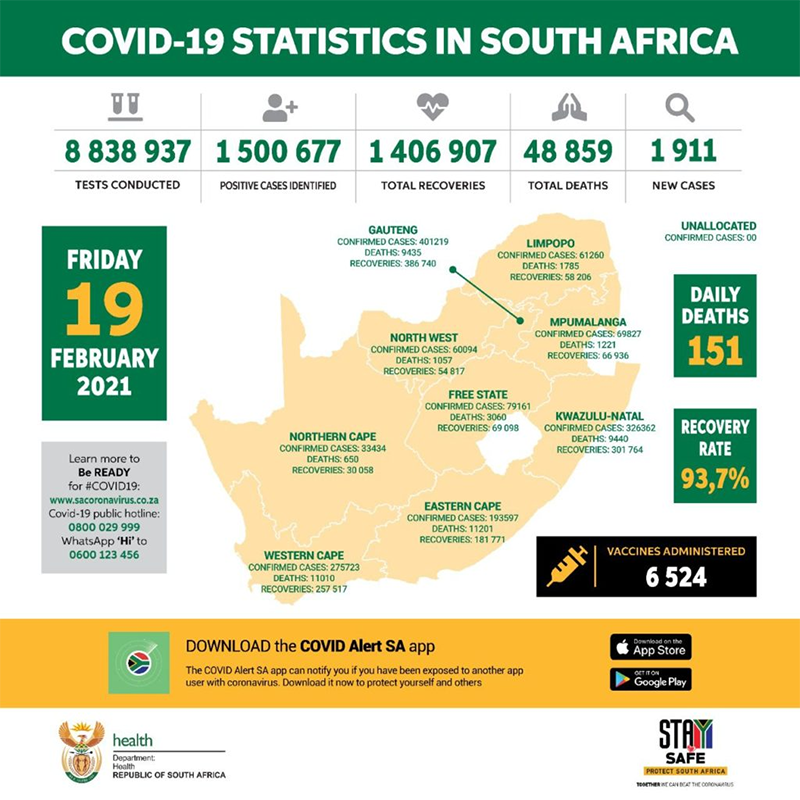 当地时间2月19日,南非卫生部确认南非当天新增新冠肺炎确诊病例1911例,累计确诊1500677例。当日新增新冠肺炎死亡病例151例,累计死亡48708例,累计康复1406907例。(总台记者 周涛)