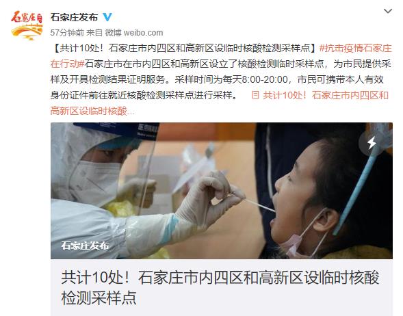 据悉,为进一步做好疫情常态化防控工作,满足群众节后开工核酸检测需求,石家庄市在市内四区和高新区设立了核酸检测临时采样点,为市民提供采样及开具检测结果证明服务。采样时间为每天8:00—20:00,市民可携带本人有效身份证件前往就近核酸检测采样点进行采样。临时采样点地址为: