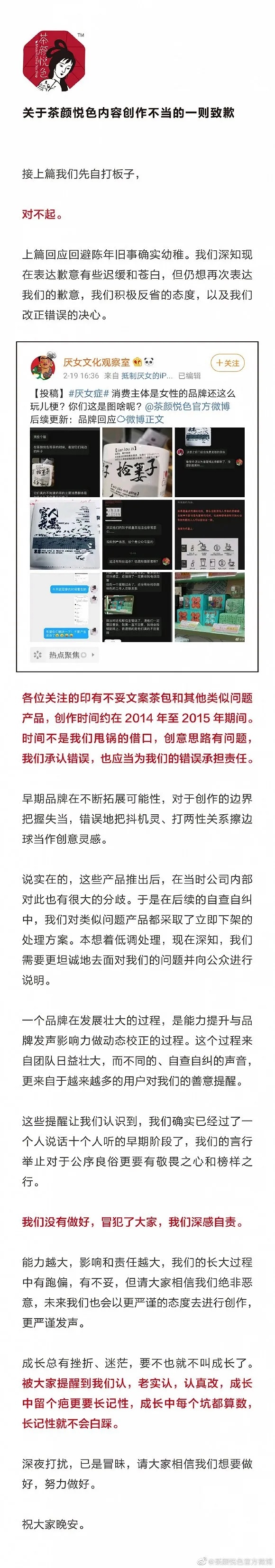 2月20日凌晨,茶颜悦色在其官方微博再次就内容创作不当致歉:“上篇回应回避陈年旧事确实幼稚。我们深知现在表达歉意有些迟缓和苍白,但仍想再次表达我们的歉意,我们积极反省的态度,以及我们改正错误的决心。”