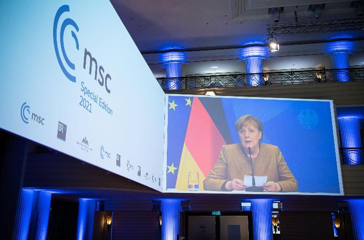 这是2月19日在德国慕尼黑拍摄的德国总理默克尔通过视频出席慕尼黑安全会议线上特别会议的画面。(新华社发,慕尼黑安全会议供图)