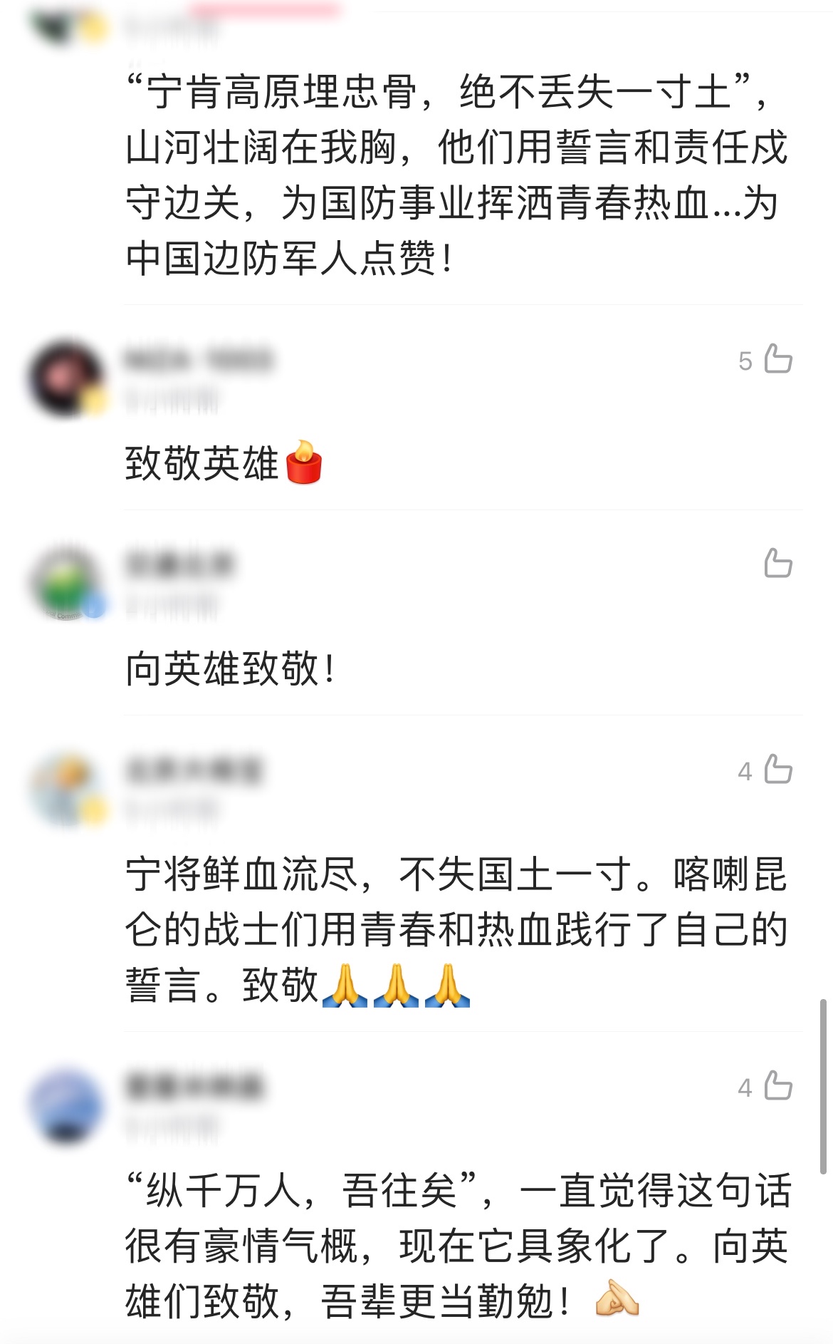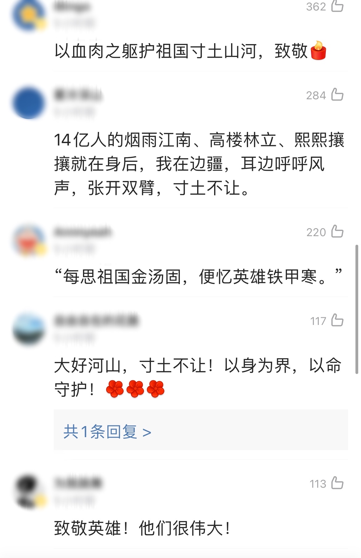 这则新闻下,网友们纷纷留言,纪念以身许国的戍边英雄,致敬伟大的边防战士!