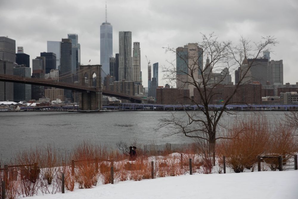 2月18日,人们走在美国纽约一个积雪覆盖的公园内。(新华社发,郭克摄)