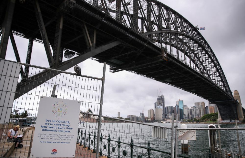 2020年12月31日,澳大利亚悉尼海港大桥下的新年烟火观看管制区域外挂起提示牌。(新华社记者白雪飞摄)