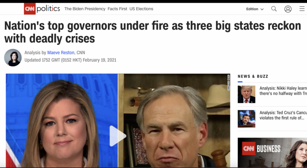 △CNN称,由于疫情、寒潮应对不力,美国几大州长深陷舆论风暴