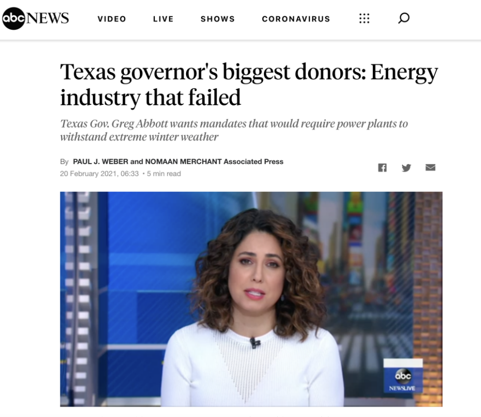 △ABC新闻称,得州州长的最大捐赠者——能源产业需要对此次能源危机负责
