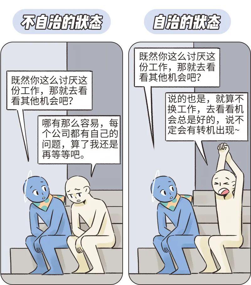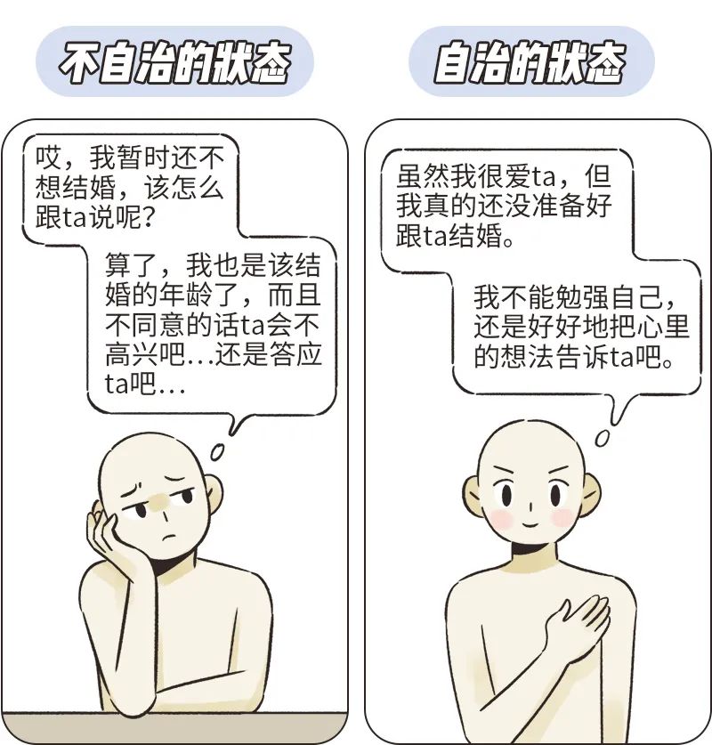 也正因此,自治能帮我们更平和地回应外界对我们的看法。面对“催婚”、“催生”时,自治的人的反应会是:做到或做不到,都不影响我存在的价值,所以不妨听听那些催的人具体有哪些考虑,也许会有对我有意义的信息。