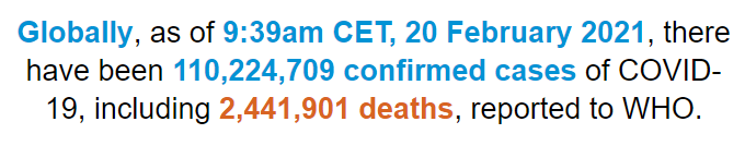 根据世卫组织最新实时统计数据,截至欧洲中部时间2月20日9时39分(北京时间2月20日16时39分),全球累计新冠肺炎确诊病例110224709例,累计死亡病例2441901例。(总台记者 朱赫)