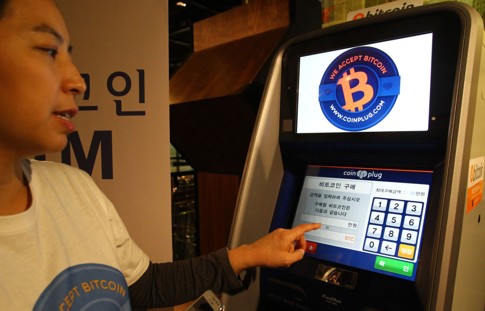 2014年3月8日,在韩国首尔,一名工作人员展示如何使用比特币自动取款机。(新华社记者姚琪琳摄)
