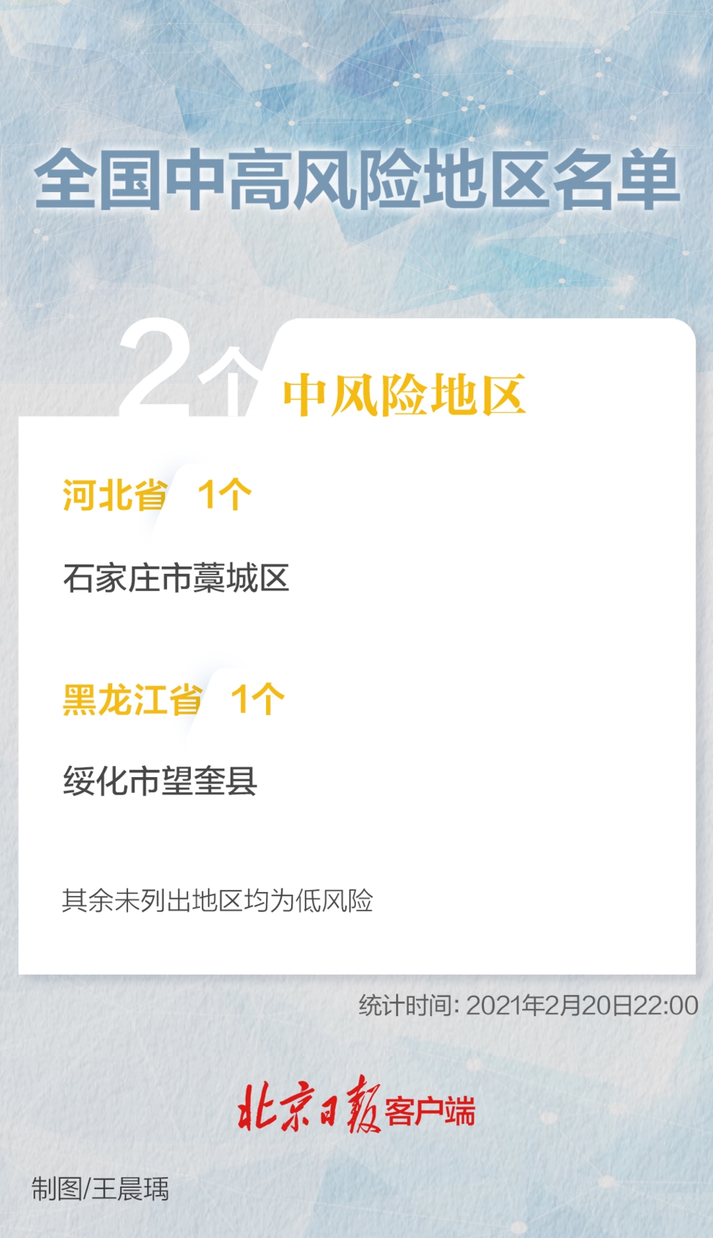 截至2月20日22时,全国疫情高风险地区已经清零,中风险地区还剩2个,分别是:
