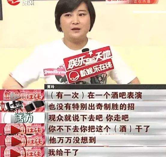 在酒吧表演,观众起哄要她下去,不想看她,不下去就把酒给喝完。结果贾玲真的把酒喝得精光。
