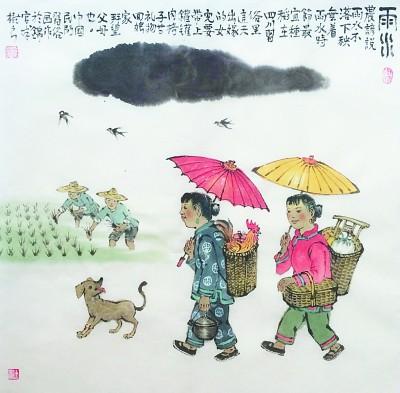 “雨水节,回娘家”,是流行于川西一带的节气习俗。戴树良的《雨水》便展现了这一场景。到了雨水节气,出嫁的女儿们,或背或挎着装有鸡鸭米面的竹篮,穿过正在春耕农忙的水田,脚步匆匆,向着娘家的路。狗子则围绕在她们身边,欢快地迎接昔日的女娃娃。与这番热闹景象相对的,是在老树的《雨水》中,世界静默,细雨落下,一人独立。如作者自白:“细雨飘然而至,春来不言离愁。有麦青青于野,有你在我心头。”面对旺盛生长的春天,雨水让千愁万绪柔软下来,即便是独身一人,也不忍苛责于谁。