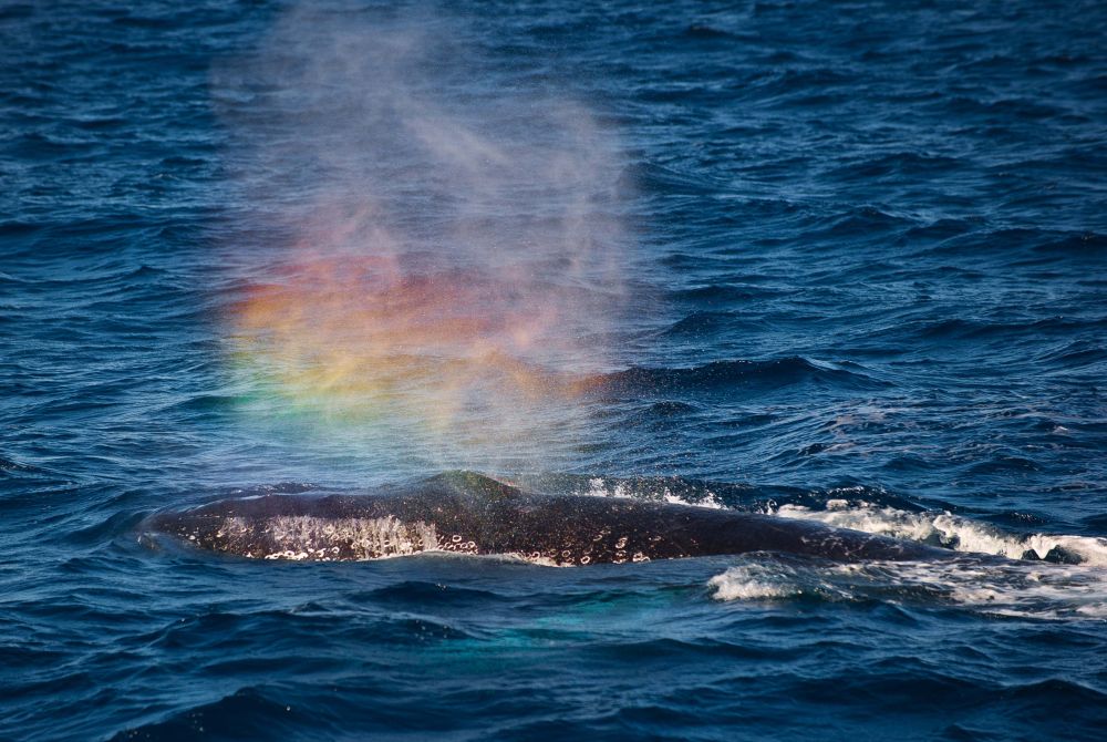 ⬆️鲸通过气孔将呼出的气和气孔附近的水一同喷出,阳光下便有了这“鲸虹”一瞥。新华社发(白雪摄)