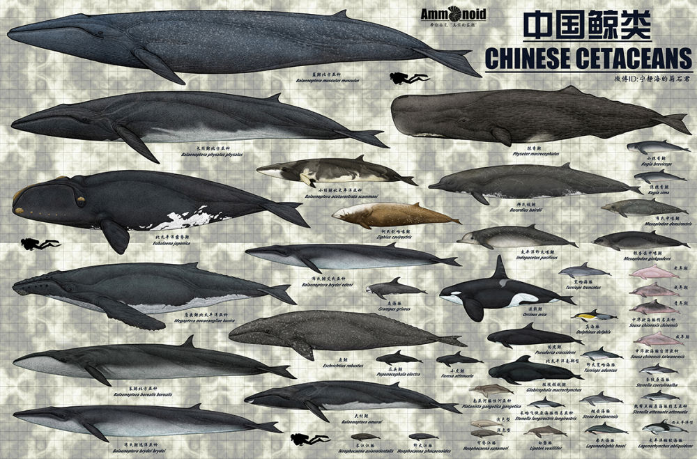 ⬆️中国鲸类图鉴,展示了中国水域可见鲸类,种类与大小对比一目了然。(科普游子自然教育首席科学绘画师 陈瑜 绘制)