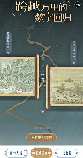 值得一提的是,在“国宝全球数字博物馆”中,藏于美国纽约大都会艺术博物馆的第三卷《康熙南巡图》和藏于法国吉美国立亚洲艺术博物馆的第四卷,在“高清拼接”和“三维全景”技术的帮助下,跨越空间的距离,实现了数字“合体”,完整高清的长幅画卷还原在游客眼前。