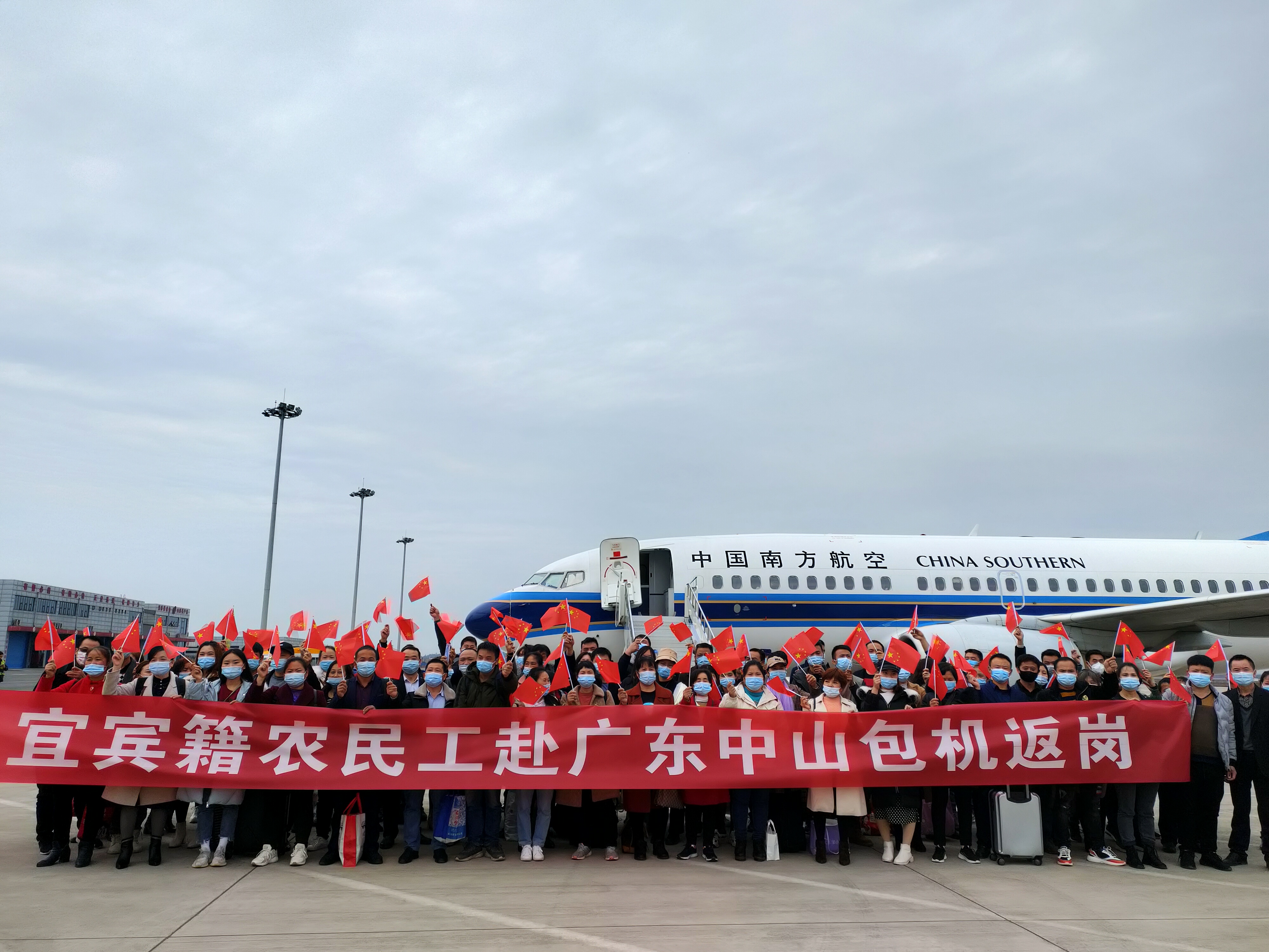 2月17日,100名宜宾籍农民工免费乘坐四川节后首趟农民工返岗专机,从宜宾起飞,前往广东。(四川省人社厅供图)