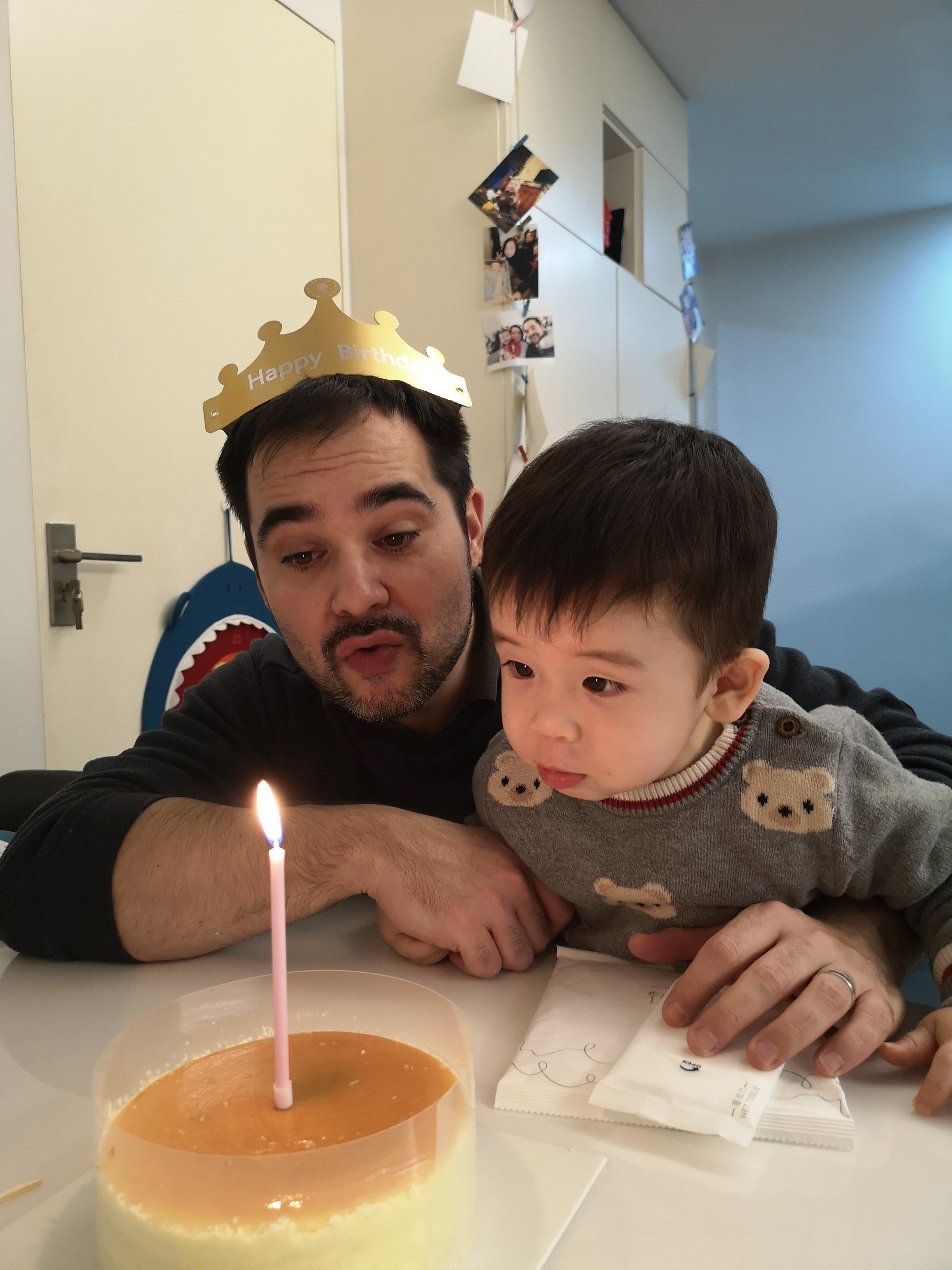 2020年居家隔离期间,巴赫和孩子一起对着蛋糕许愿,期盼武汉早日恢复往常活力。受访者供图