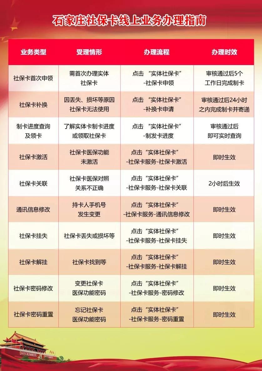 石家庄市社会保障卡首次申领、补(换)卡、挂失、解挂、密码修改与重置、持卡人信息查询等10余项高频业务已全部实现网上办理,快递到家。市民可以在“石家庄社会保障卡”微信公众号,享受7×24小时“不见面”服务。