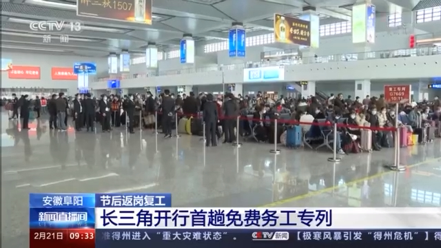 为方便务工人员节后返岗复工,今天(21日)上午,载有800多名务工人员的G7669次专列,从安徽发往宁波,这也是节后长三角地区开行的首趟复工定制专列。