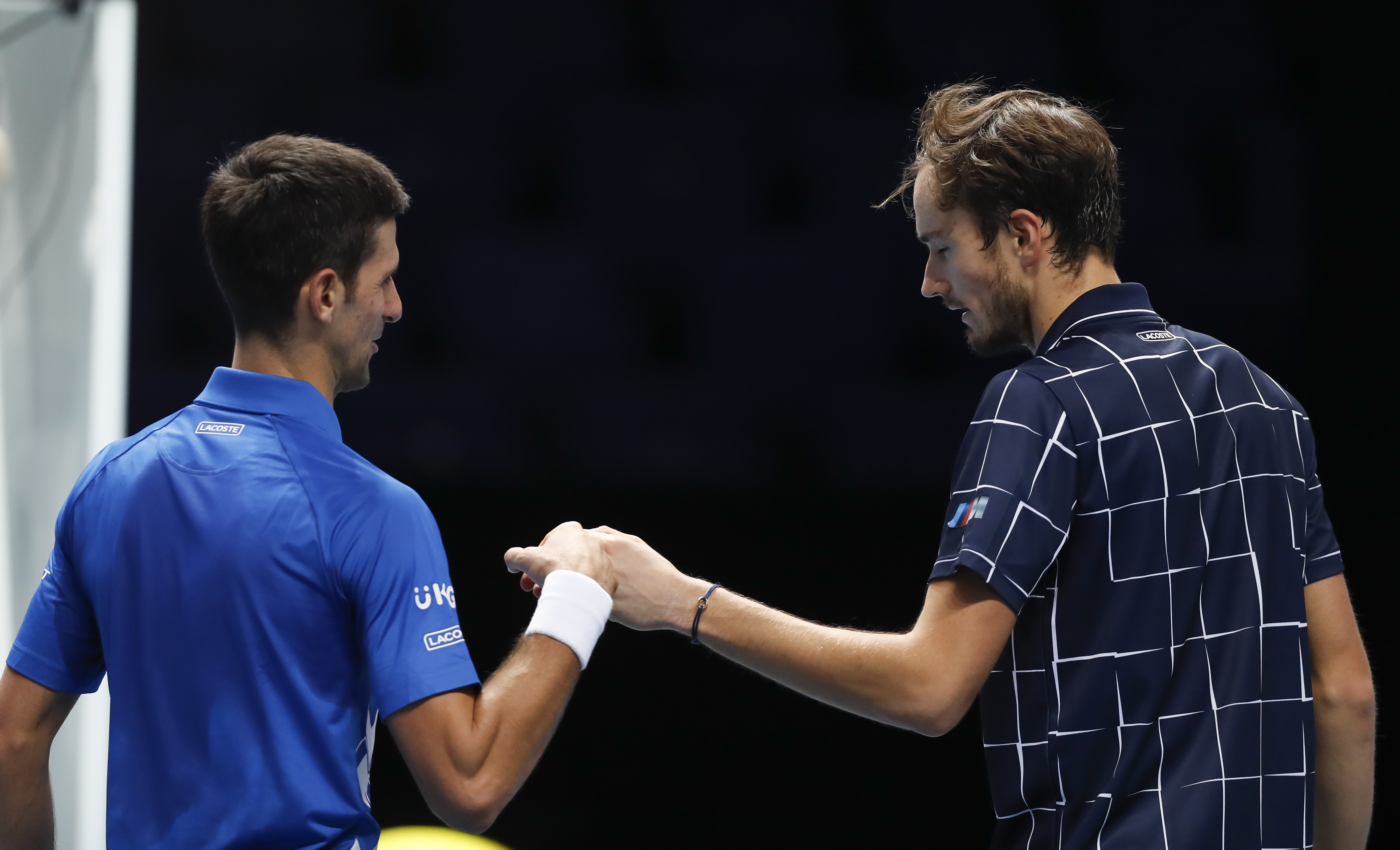 2020年11月18日,梅德韦杰夫(右)与焦科维奇在ATP年终总决赛比赛后致意。新华社记者韩岩摄