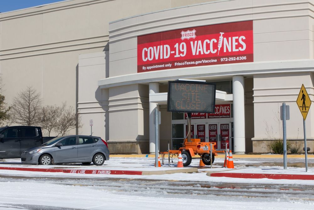 2月19日,在美国得克萨斯州达拉斯市北郊,一家疫苗接种中心外的显示屏显示关闭的字样。受到冬季风暴和停电影响,美国得州部分地区的新冠疫苗运输受到影响,一些疫苗接种中心被迫关闭。(新华社发,田丹摄)