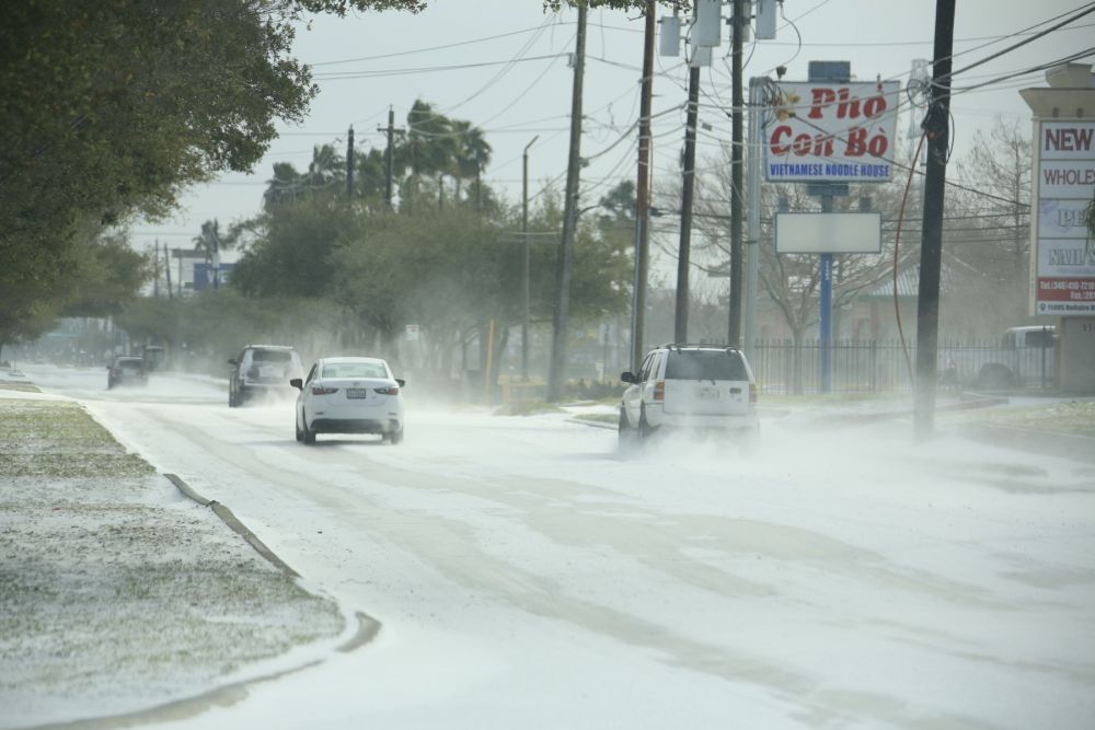 2月15日,在美国得克萨斯州休斯敦,车辆在积雪的道路上行驶。(新华社发,劳承跃摄)