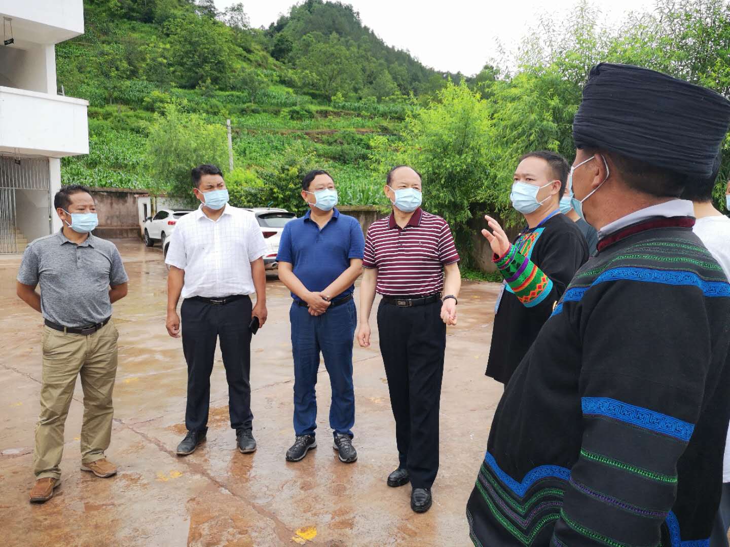 2020年7月9日,达久木甲(左四)在美姑县候播乃托乡督导教育扶贫工作。(四川省凉山州人大常委会供图)