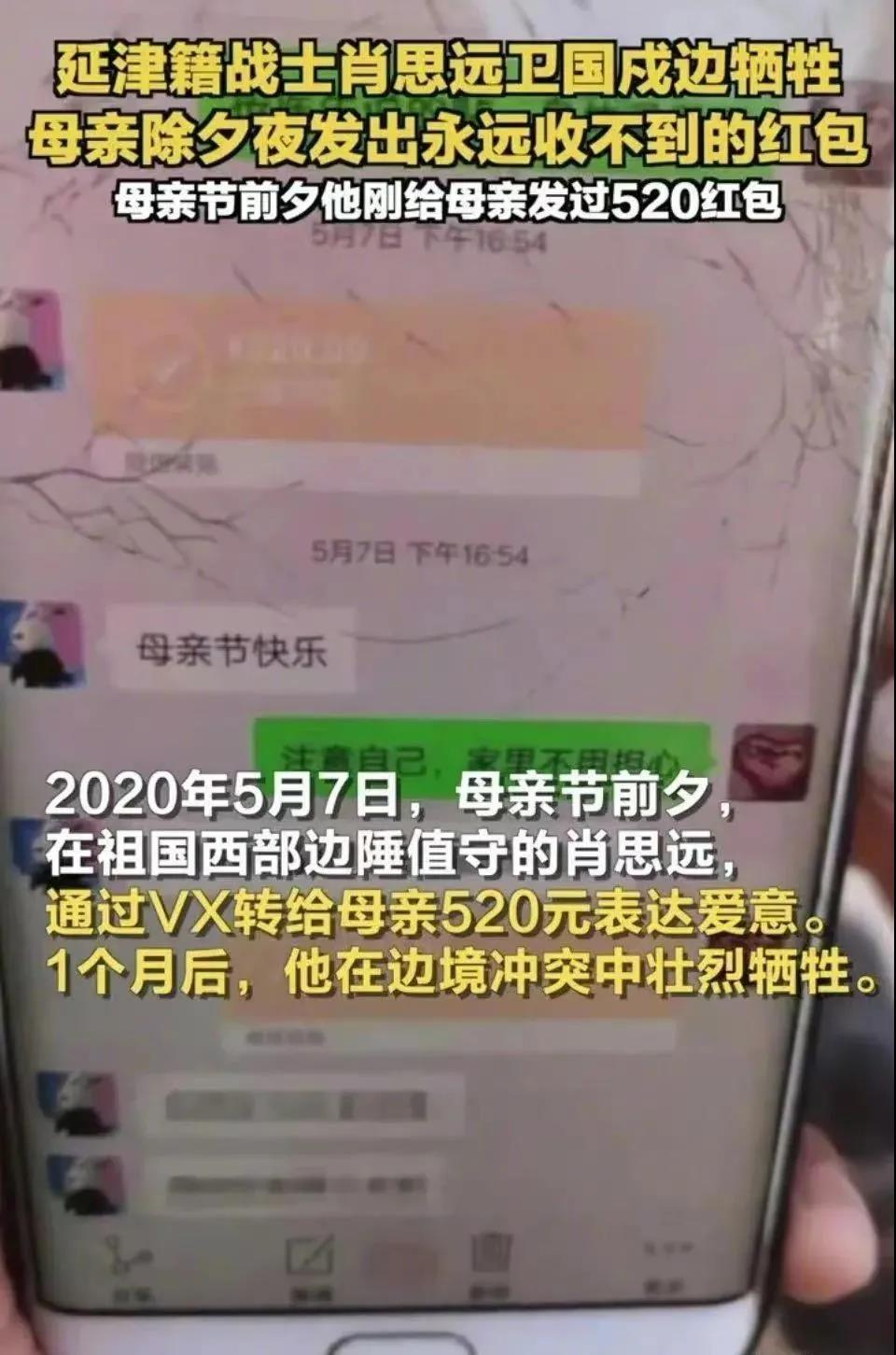 这张微信截图还显示,2020年5月7日,母亲节前夕,在祖国西部边陲值守的肖思远,通过微信给母亲520元表达爱意,不幸的是,一个月后,他在边境冲突中壮烈牺牲。而母亲在除夕夜发出了一个他永远收不到的红包……