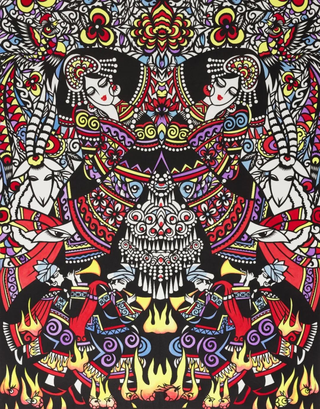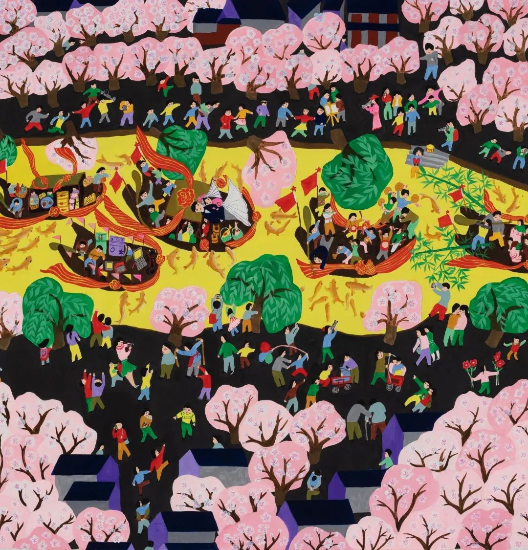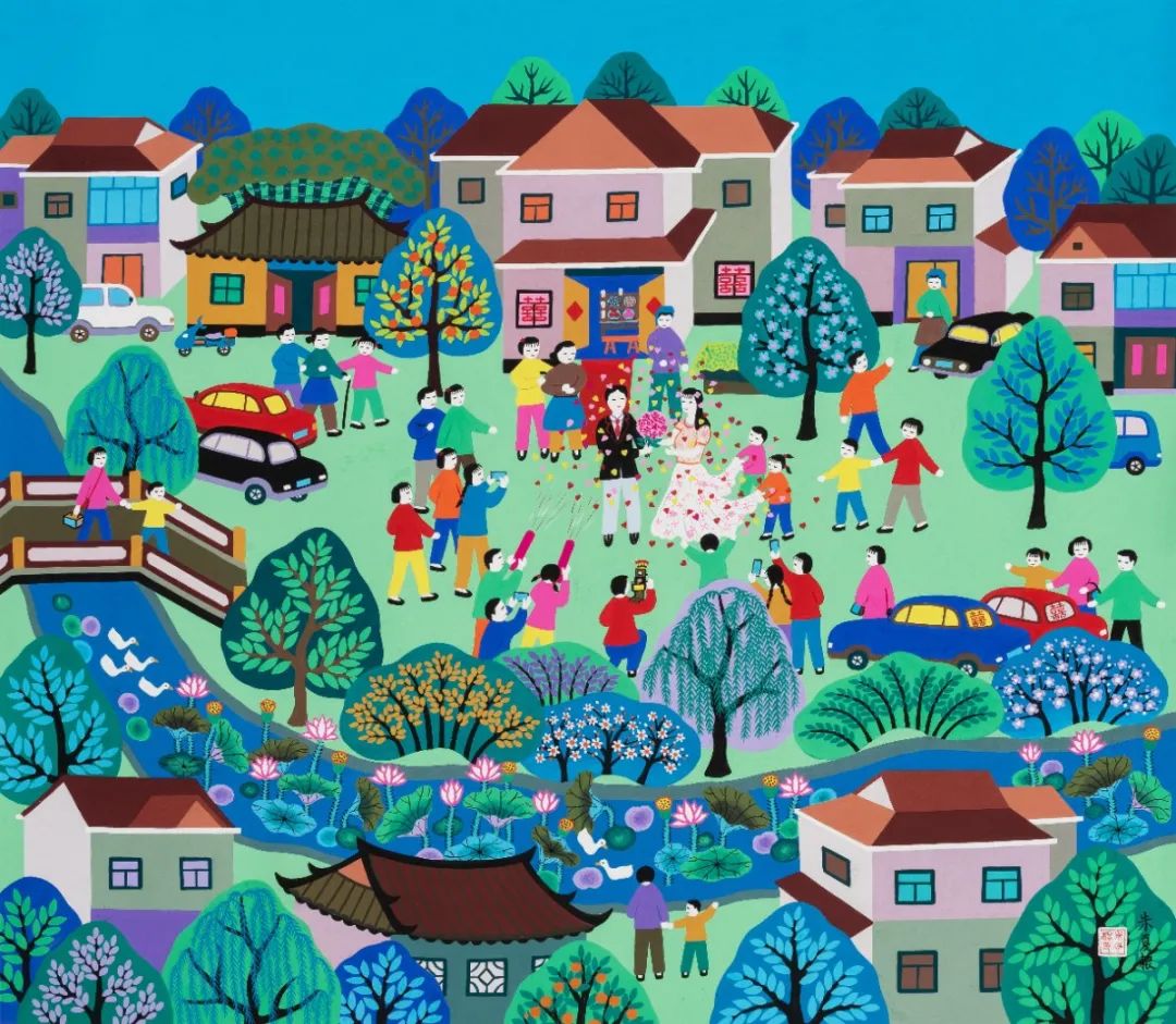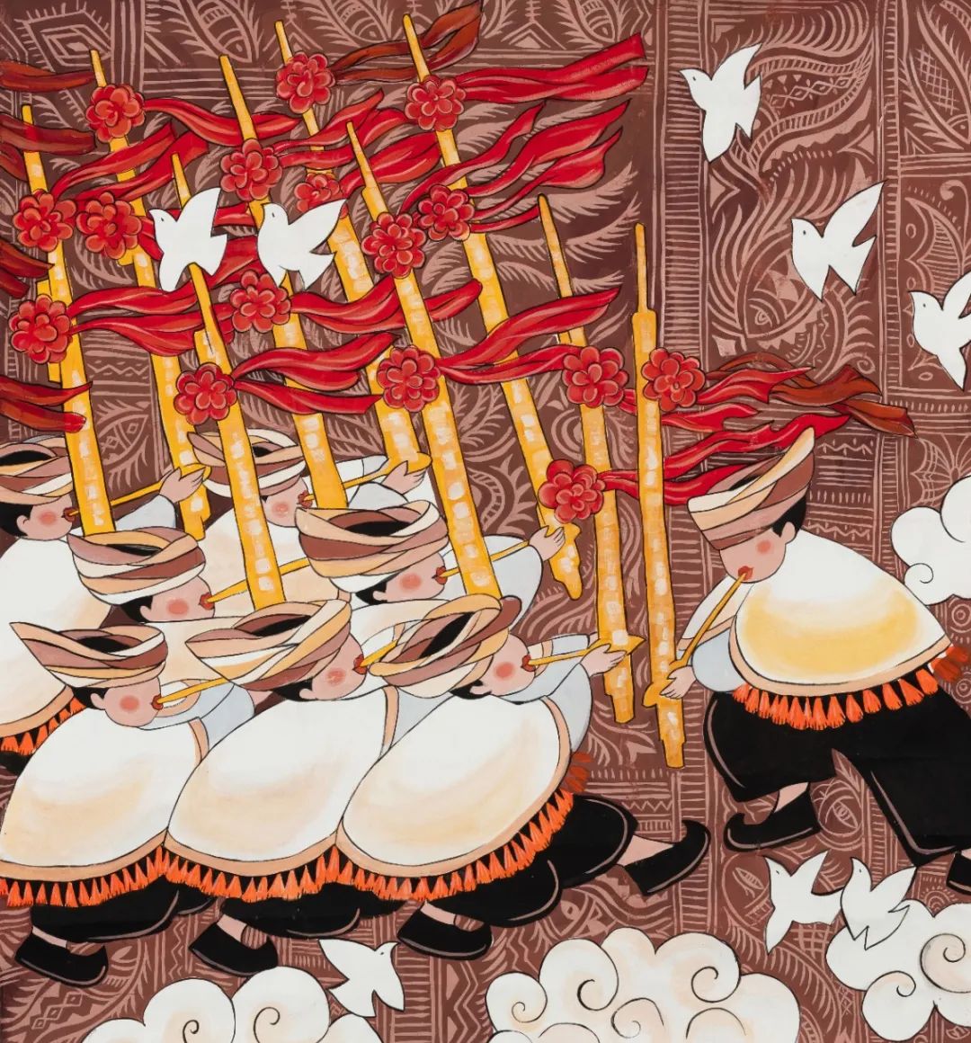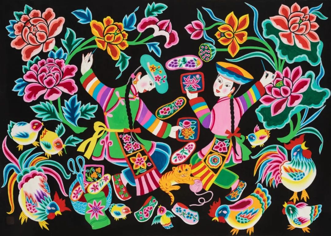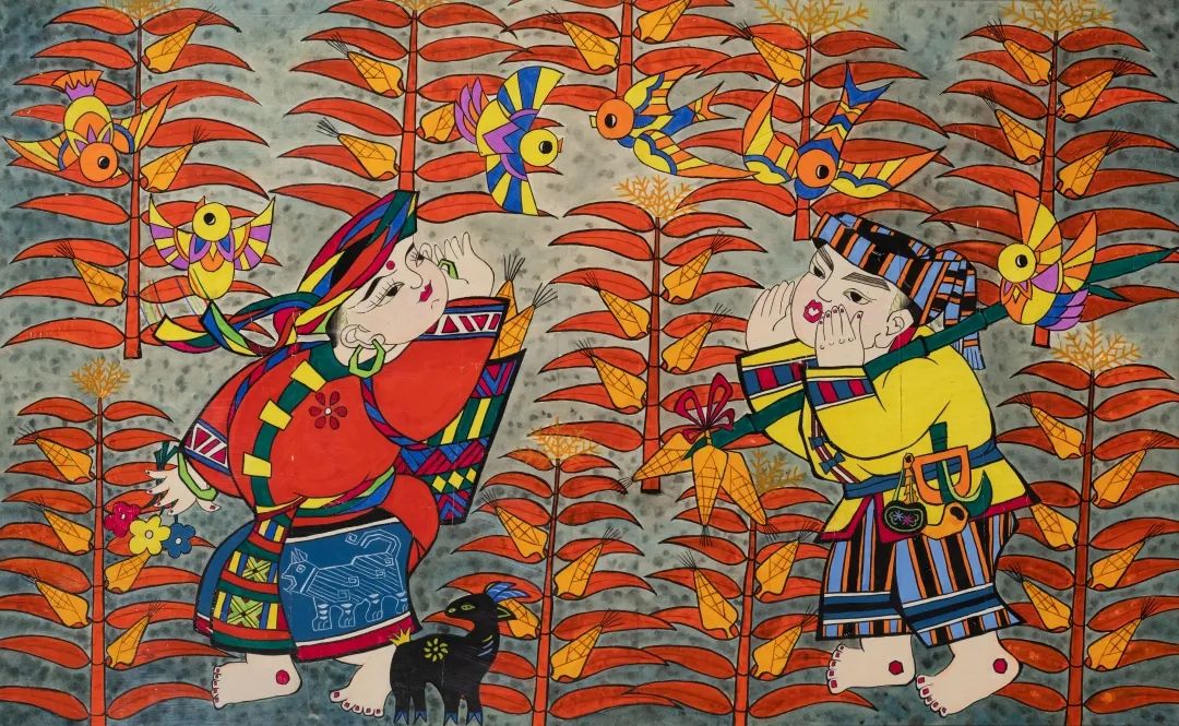 《锦绣人生》用农民画技艺表现了少数民族妇女们以刺绣的手艺为生,用勤劳的双手绣制着中华大好河山,绣出为中华梦想而奋斗的锦绣人生。农民画的表现手法有明显的地域特色,它以红绿的色彩,夸张的描述,寓意深刻的主题,简洁明快的风格勾画出了美丽的田园风光,气氛热烈的劳动场面和欢天喜地的节日庆典,充分体现民间艺术的特点。