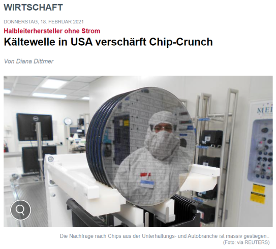 德国新闻电视台近日报道,受到北极寒流影响,美国得克萨斯州出现供电短缺问题,当地芯片制造商不得不关闭工厂,导致全球半导体市场的形势变得越来越紧张。