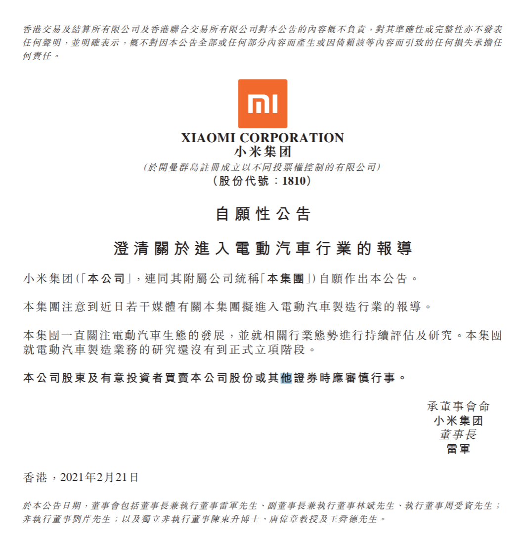 2月21日,小米集团发公告称,近日注意到有关小米集团进入电动汽车制造行业的报道,小米集团一直关注电动汽车生态的发展,并就相关行业态势进行持续评估及研究,小米集团就电动汽车制造业务的研究还没有到正式立项阶段。