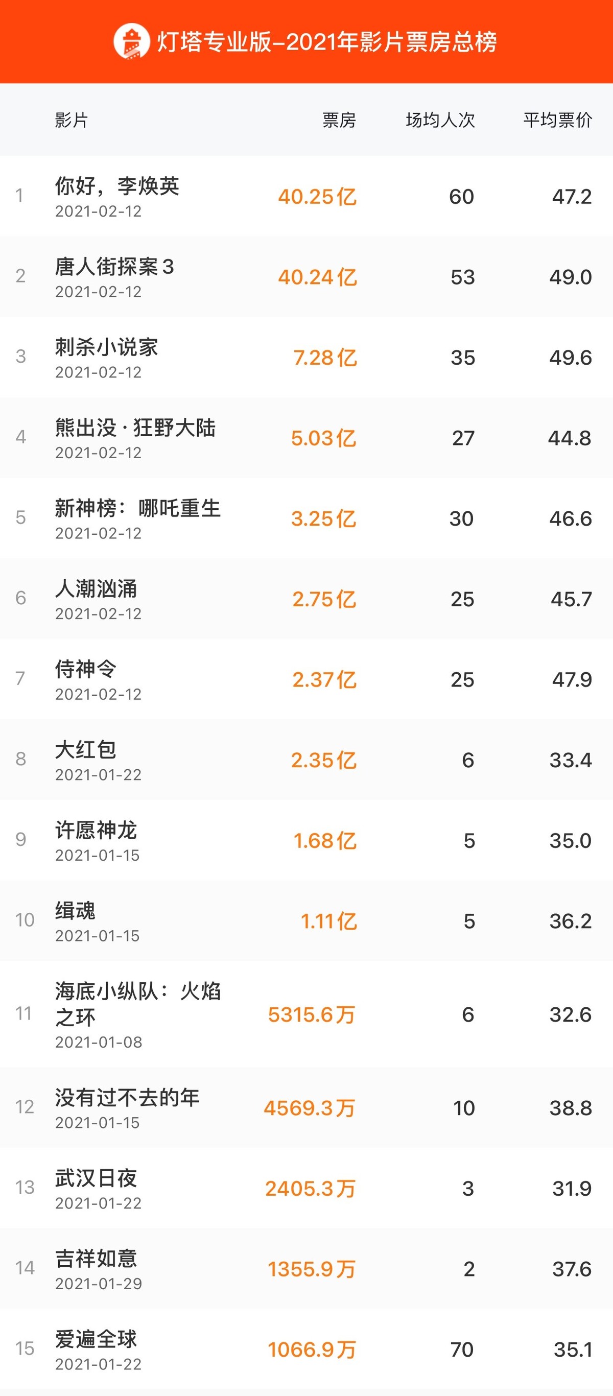 据灯塔实时数据,2月21日晚22时08分,《你好,李焕英》以40.25亿票房,反超《唐人街探案3》。数据显示,《唐人街探案3》票房为40.24亿。