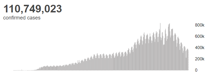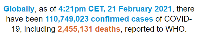 根据世卫组织最新实时统计数据,截至欧洲中部时间2月21日16时21分(北京时间2月21日23时21分),全球累计新冠肺炎确诊病例110749023例,累计死亡病例2455131例。21日全球新冠肺炎确诊病例新增359488例,死亡病例新增9075例。(总台记者 朱赫)