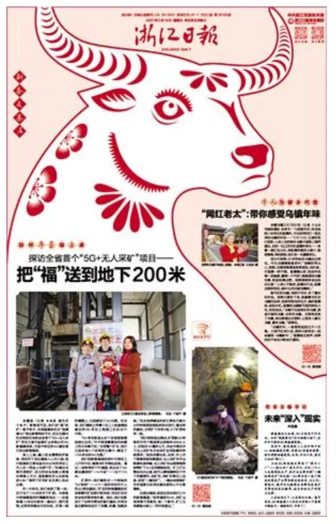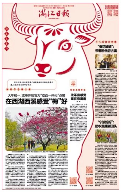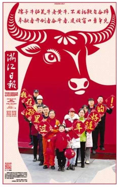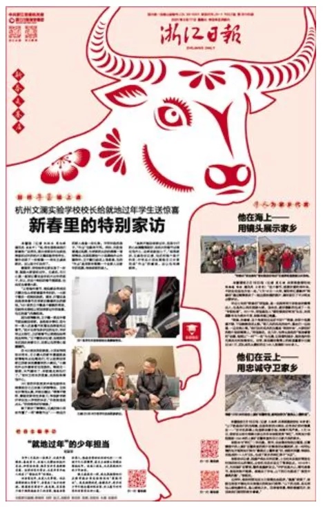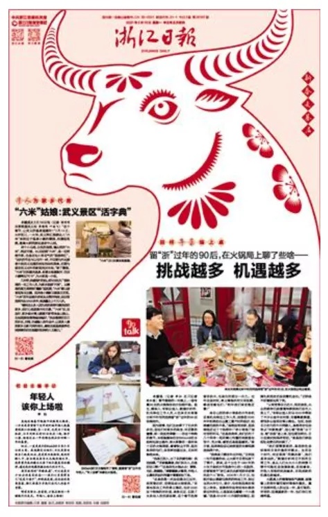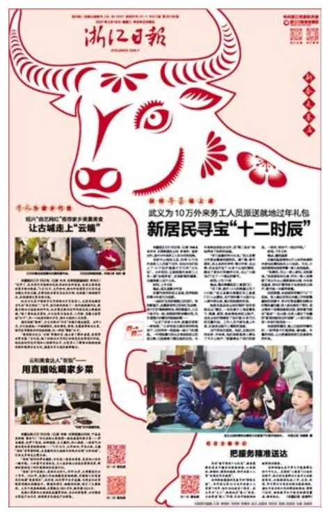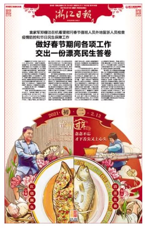 《浙江日报》在几家春节期间仅出刊两个版的省级党报中比较有特色:一是版式设计比较大胆,每天版面上有一个剪纸风格的牛,有中国风范,把春节的气氛与农历牛年很好地融合在一起;二是主题集中,内容主打“留浙过年”和“新春走基层”,国内不同地方的特色美食与浙江各地的特色风味以新年画的方式呈现,比较有创意,也切合“留浙过年”的主题,每天配发的小言论提升了报道主题;三是文字、照片等同时配发二维码,适应了融合传播的需要。
