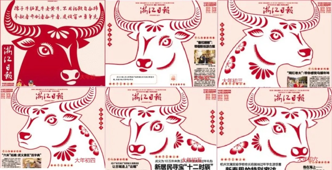 《浙江日报》2021年春节期间每天两个版,每天都有一个剪纸风格的牛,作为版面主打。