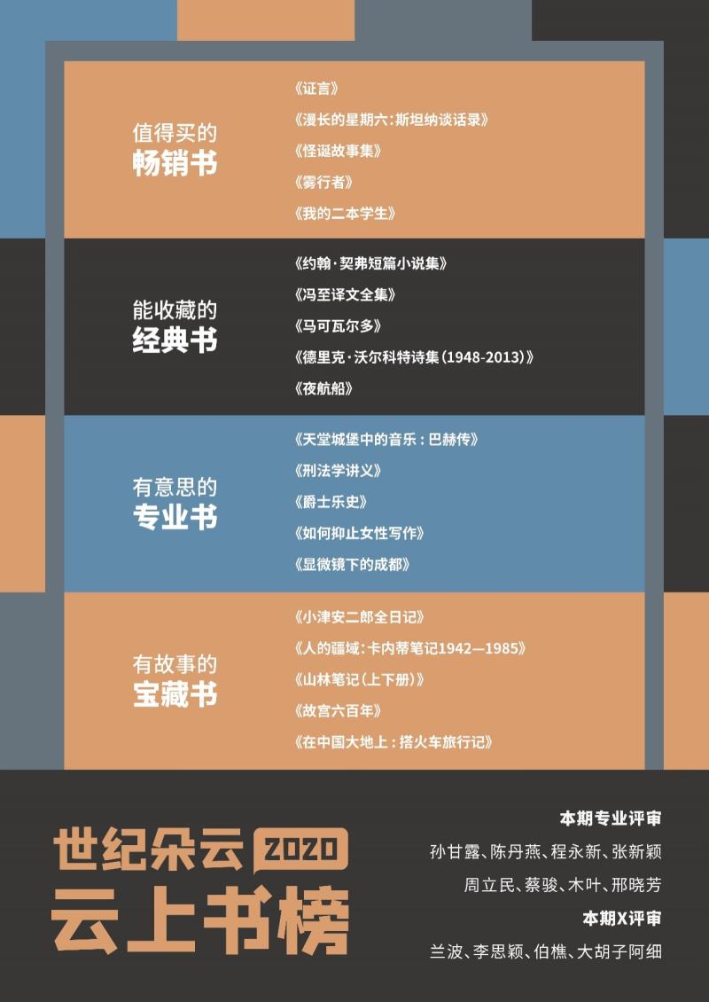书榜从“值得买的畅销书”“能收藏的经典书”“有意思的专业书”“有故事的宝藏书”四个维度,为读者从茫茫书海中甄选好书,2020年9月起已评选出六期榜单。此次年榜候选书单邀8位专业评审和4位“X评审”,由前六期上榜图书和评审补充书单组成,最终评出4大类别共20本上榜图书。